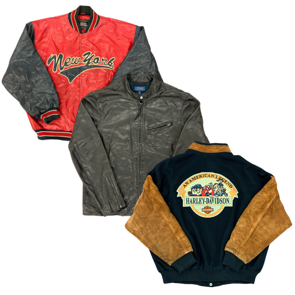 Our Premium leather and varsity jacket bundle includes branded premium jackets, pro sport leather, varsity jackets from famous sports teams, among other premium jackets. This is an A/B graded bale, these may include broken zippers and buttons.