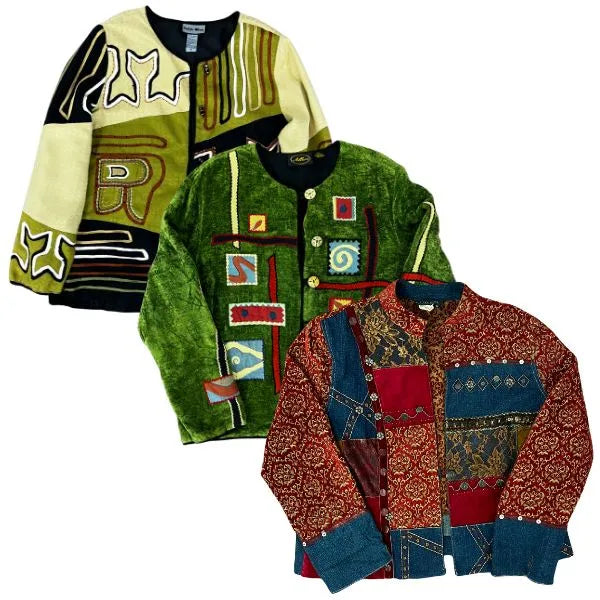 Our floral embroidered jacket bundle features various graphic designs on jackets that come in a range of colours, sizes, and styles.