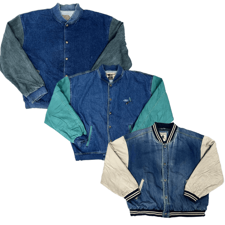 Denim Stadium Jackets bale includes a mix of vintage denim jackets featuring classic varsity-style designs. These jackets come in a range of sizes, colours and styles, ideal for adding a bold and trendy outerwear option to your shop's fall and winter collection. Perfect for customers seeking a versatile and timeless layer with a unique, retro flair