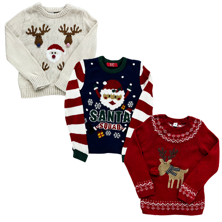 Our Kids Christmas Sweater Bale includes a variety playful christmas and winter themes sweaters.There are a variety of colours, styles and kids sizes in this bale.