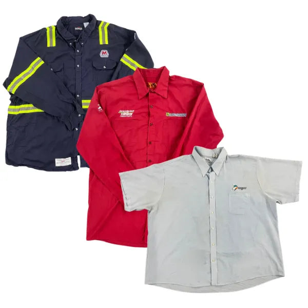 This work shirt bundle features a range of durable shirts. These work shirts may have stains, holes and other signs of wear.
