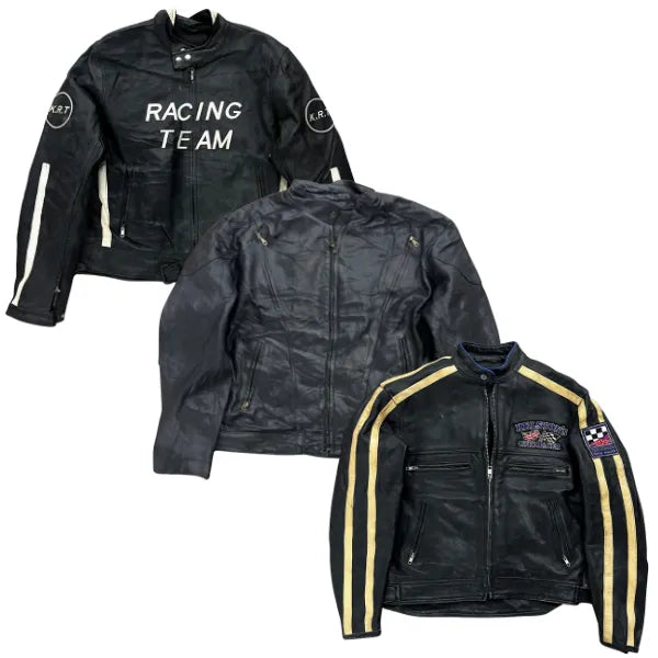 Our motorbike leather racing jackets are genuine leather jackets in a biker race design on the collar. Some of these jackets are padded for protection, however not all of them are.