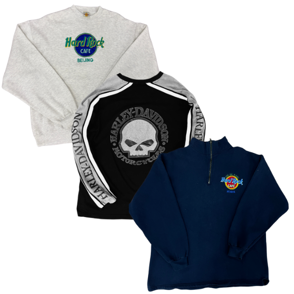 Our Harley & Hard Rock Sweat Hoodie bundle includes a mix of iconic hoodies featuring bold prints and logos from Harley-Davidson and Hard Rock Cafe. Expect various colours, sizes, and styles — perfect for vintage lovers and collectors of classic branded pieces.