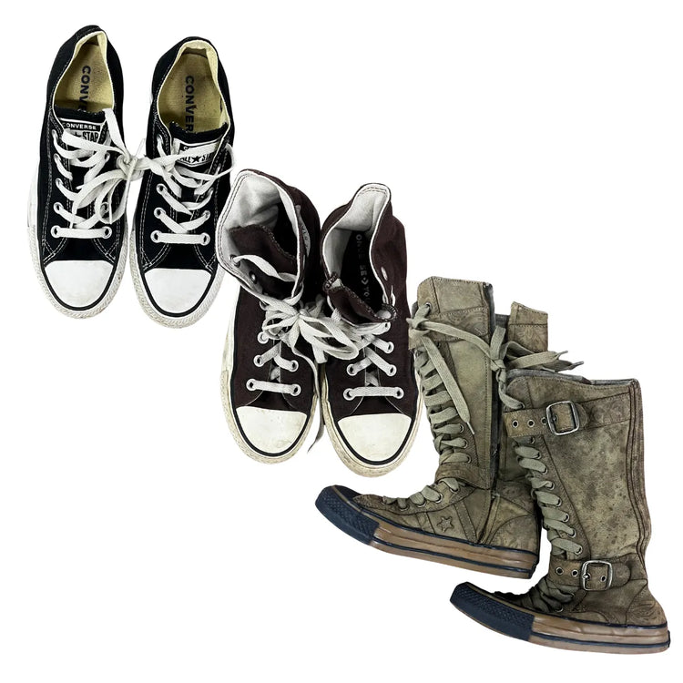 Our Converse Shoes bundle features a mix of classic and modern styles, including high-top and low-top designs in various sizes and colours. Iconic, versatile, and always in style — perfect for everyday wear or adding vintage streetwear flair to your collection. Please note these are second hand, worn shoes. Grade A comes with imperfections.
