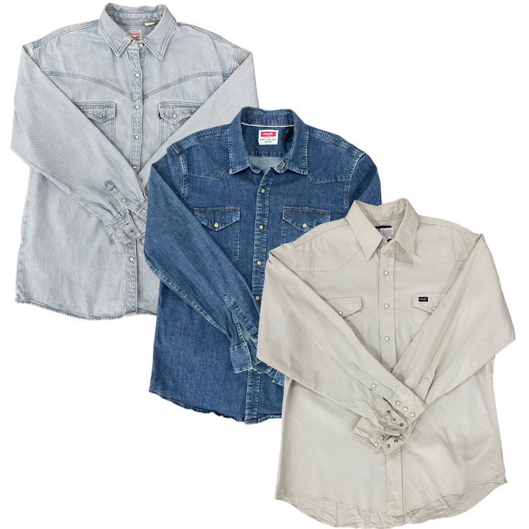 Our LLW Denim Shirt bundle includes a variety of classic denim shirts in different sizes, washes, and styles.
