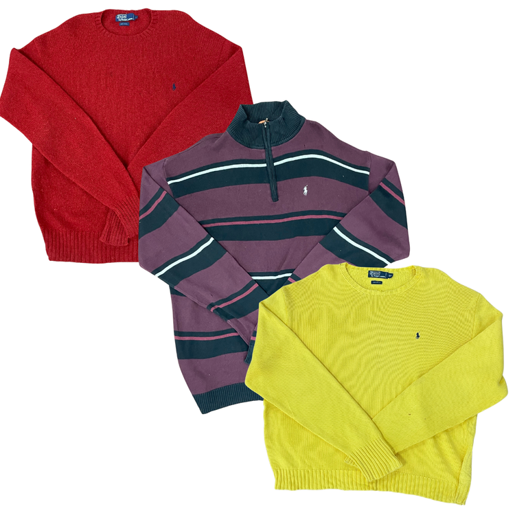 Our Polo Knitwear bundle (Grade B) includes classic knitwear pieces in various sizes, colours, and styles. Expect minor signs of wear, small marks, or imperfections typical of Grade B items — perfect for vintage lovers or resellers looking for quality knitwear with character.