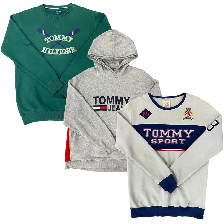 Our Tommy Sweat Hoodie bundle features a variety of bold, branded hoodies in different sizes, colours, and styles.