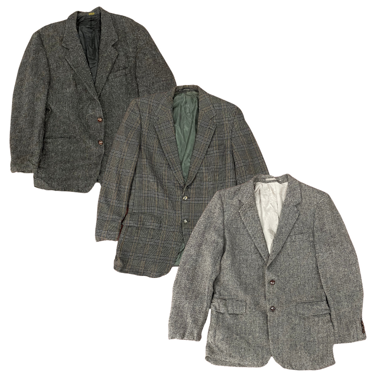 This bundle of formal tweed jackets has a gorgeous academic aesthetic. Your order will contain a range of colours, styles, and sizes.